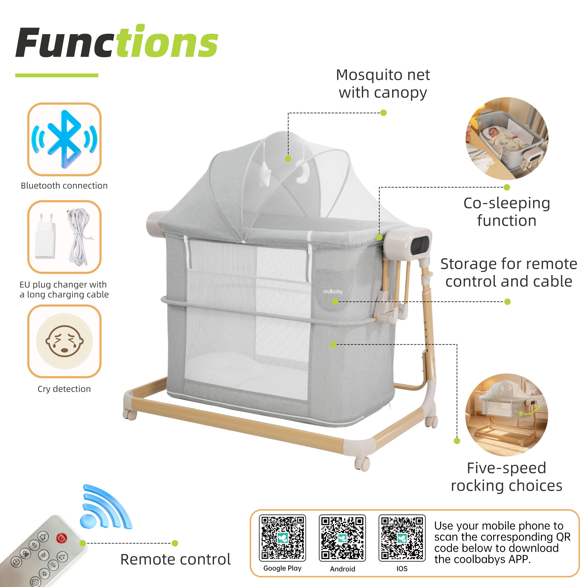 Ხუთი სიჩქარის რყევის რეჟიმი. 3 ტაიმერის პარამეტრი. 5 სიმაღლის რეგულირება. თანა ძილის ფუნქცია. Ჩანთის რეჟიმი. თამაშის ველის რეჟიმი. Საწოლში ჩასმის ჩანთა. Bluetooth შეერთება. Ტირილის გამოვლენა. 11 ძინების სიმღერა ხმის რეგულირებით. Ანტი-რეფლუქსი დახრილი. ბალდაქინიანი კომბოსტო. Დისტანციური მართვა. მაგრამ ხსნიანი მატრაცი. Ადგილი დისტანციური მართვის პანელისა და კაბელისთვის. |