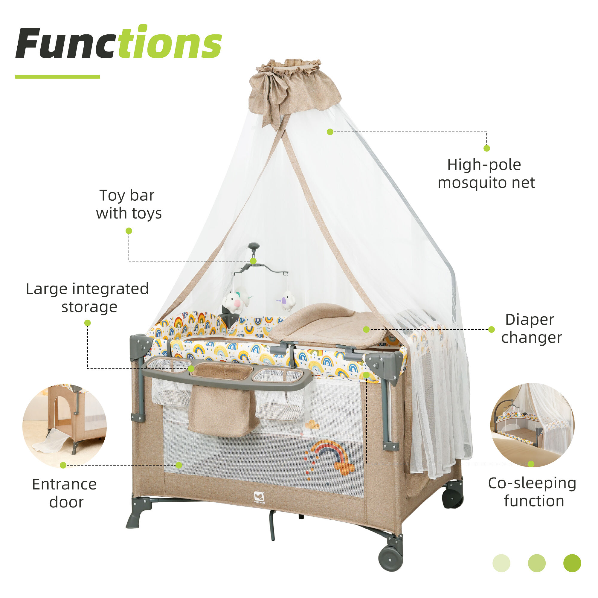 • All-in-One Multifunctional Design: 9 Core Functions in OneIntegrates co-sleeping bed, baby playard, foldable mattress, EU-standard diaper changer, rocker, high-pole mosquito net, music toy bar, large storage, and easy-access entrance—eliminating the need for separate baby gear (e.g., standalone rockers, diaper stations, or toy racks). This “one-stop” solution covers all daily needs (sleep, play, care, storage) for babies, saving home space and simplifying parenting tasks, making it ideal for busy families.