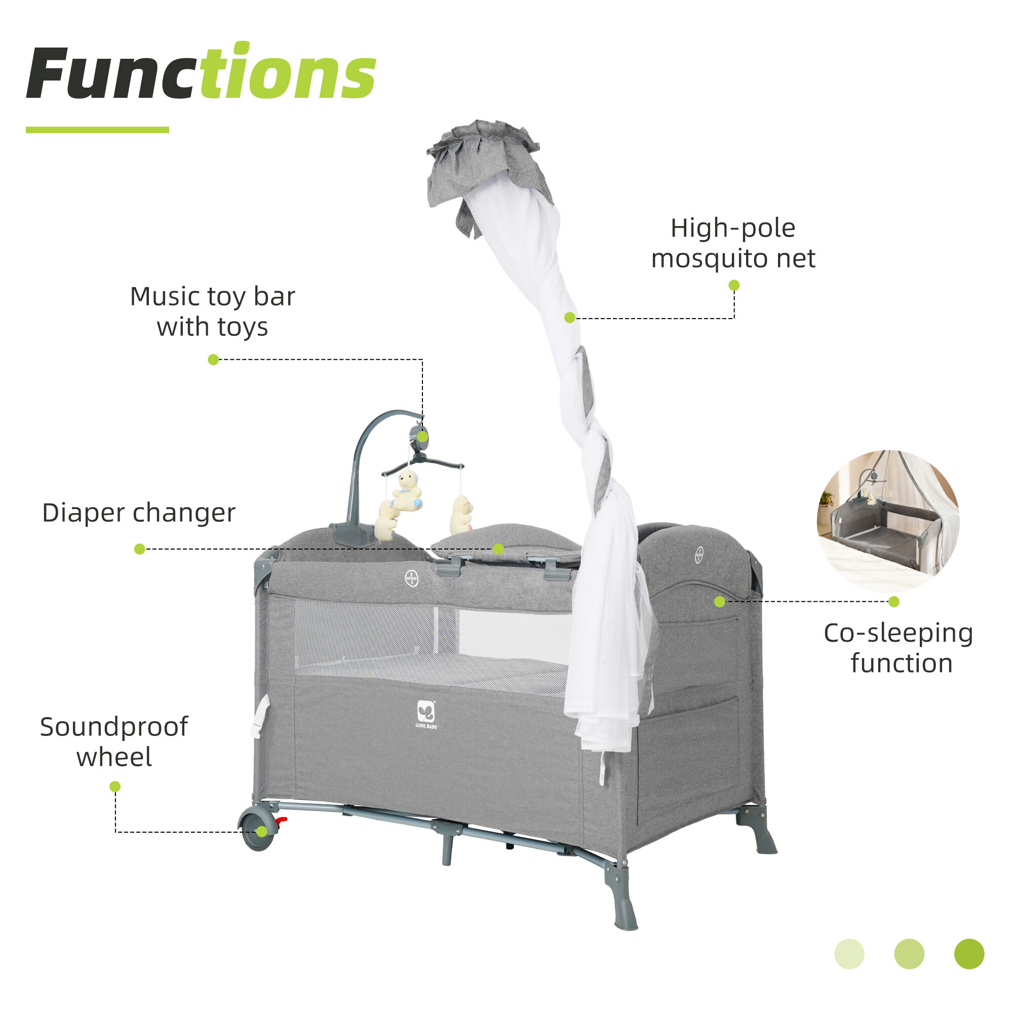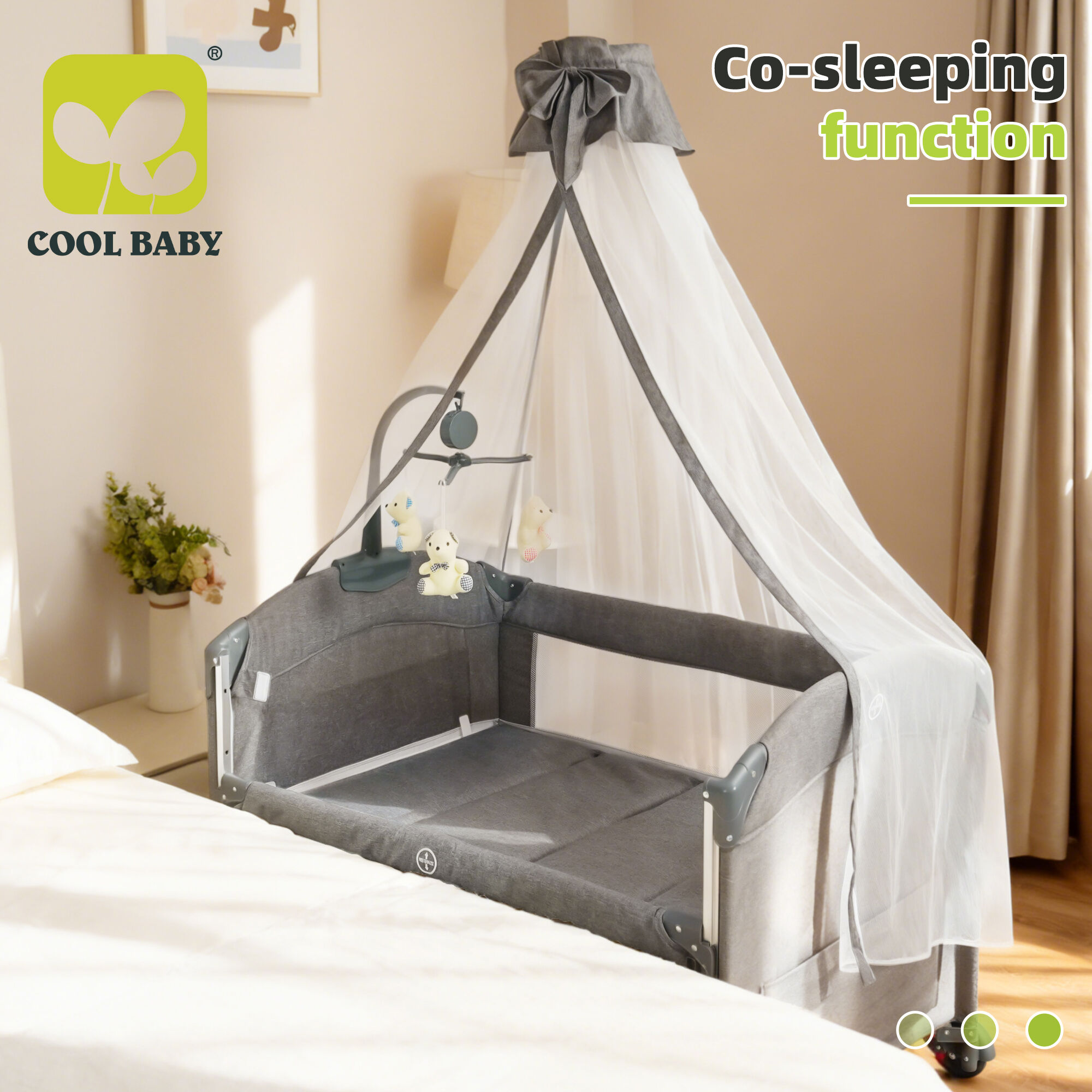 • Practical Mobility: Equipped with soundproof wheels, the crib glides quietly between rooms—perfect for moving your baby from the nursery to the living room without disturbing naps.