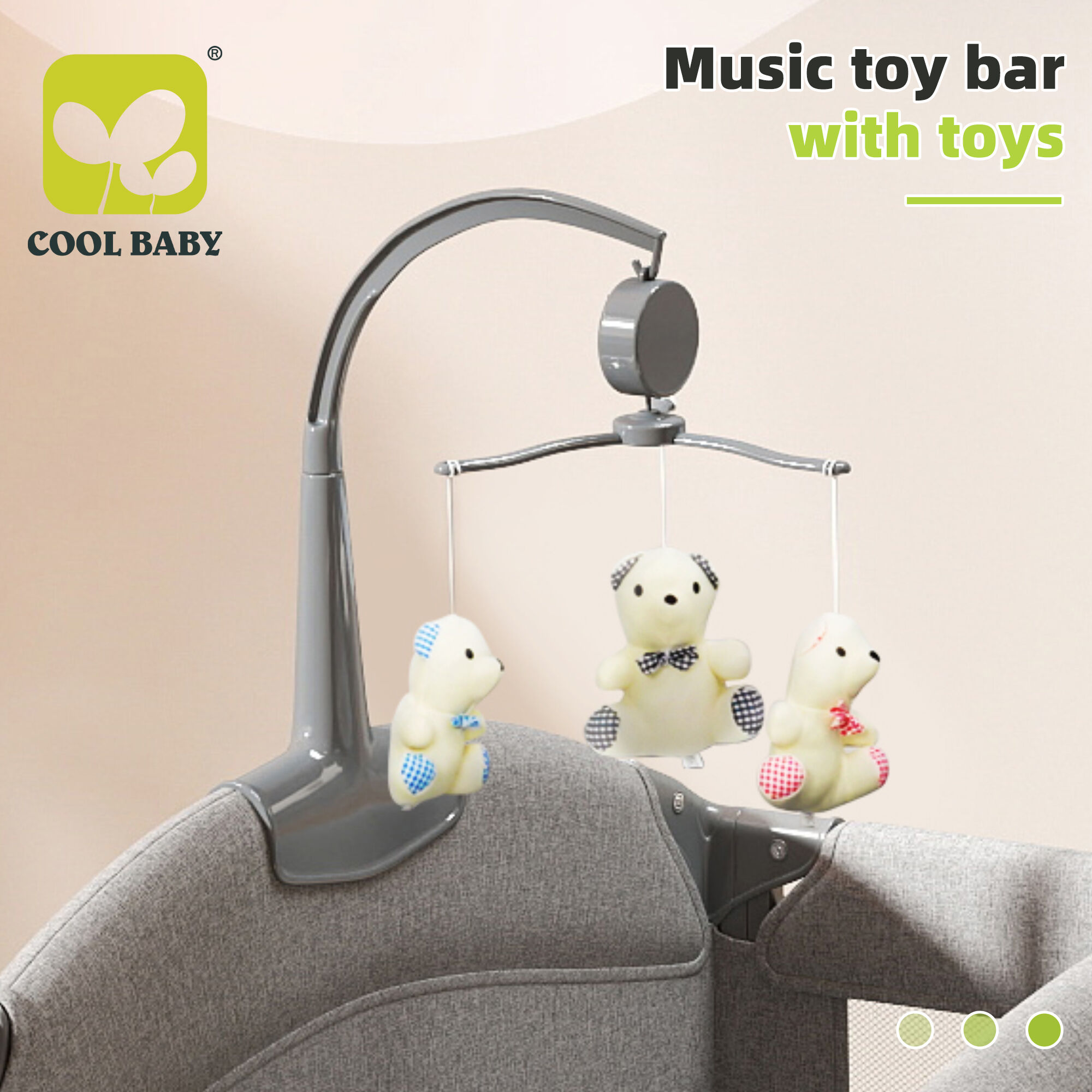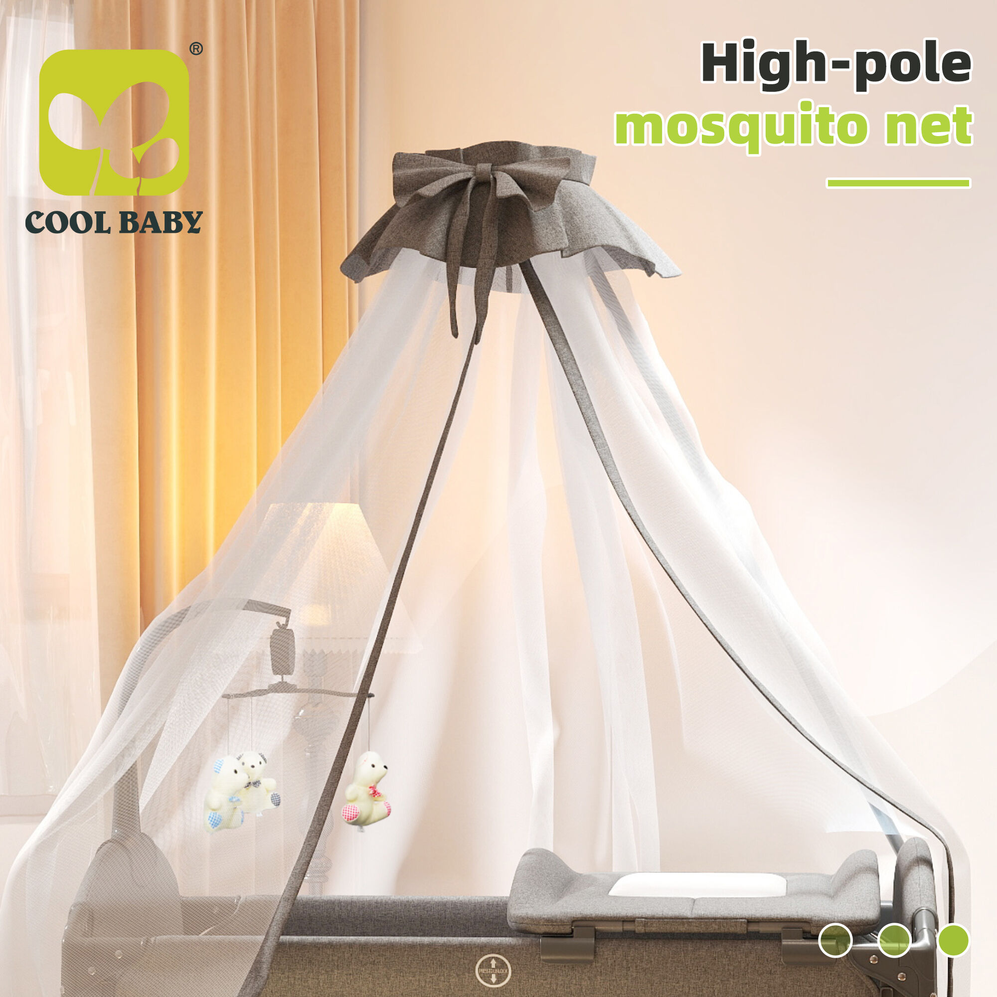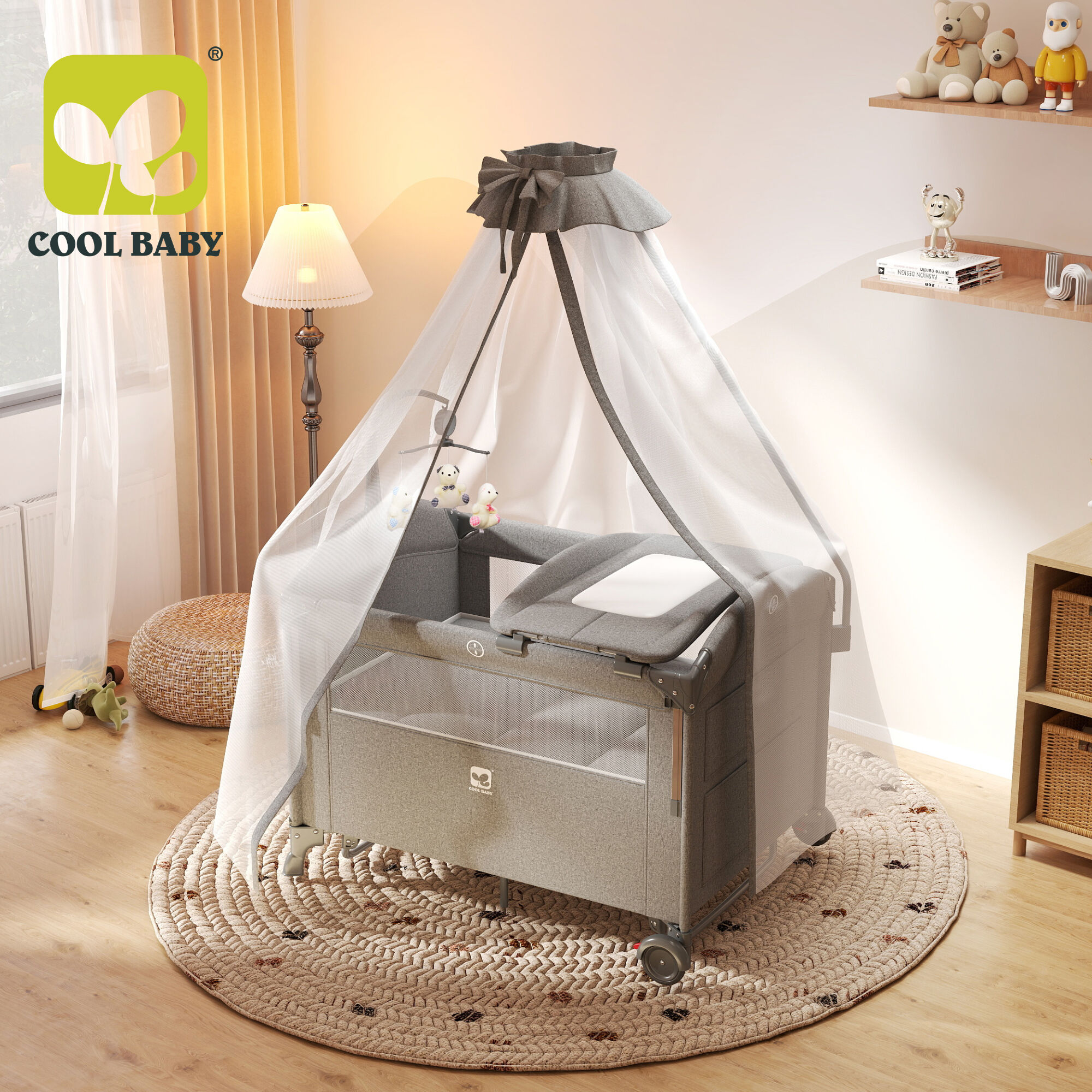• Soothe & Stimulate: A (music toy bar with plush bear toys) hangs above the crib, playing gentle tunes to calm fussy babies and encourage sensory development. A(high-pole mosquito net) with a decorative bow not only shields your little one from insects but adds a whimsical, tent-like charm to the space.