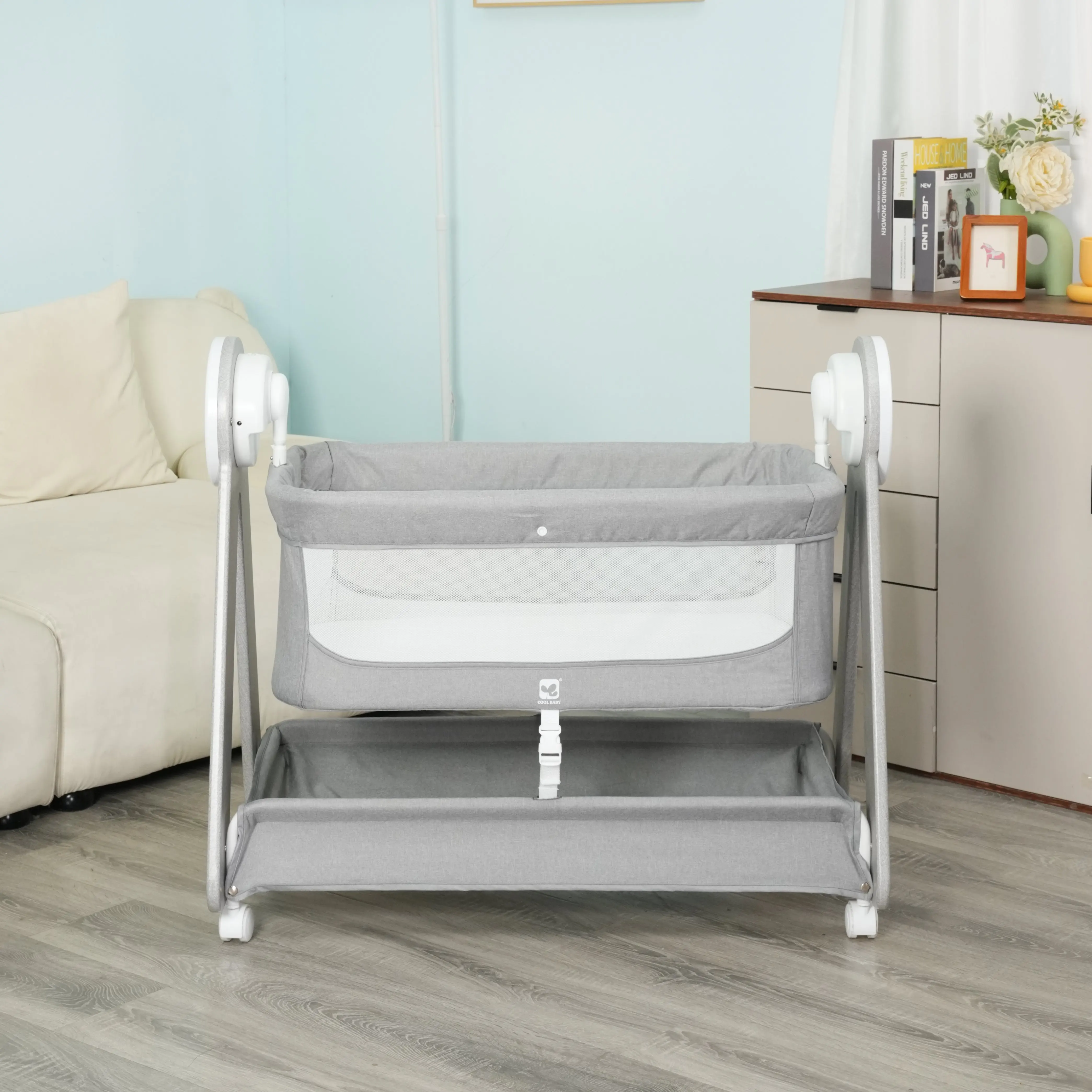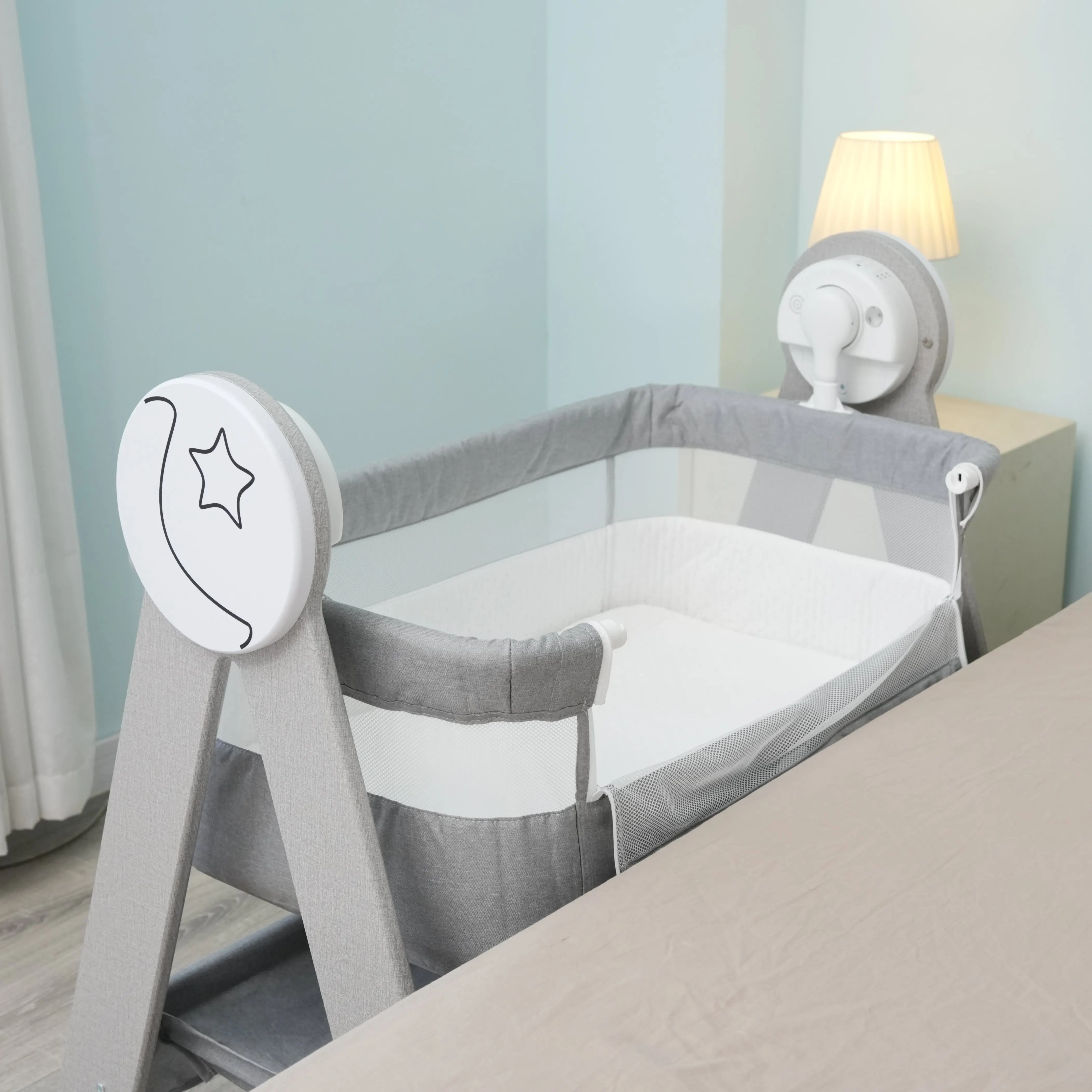 Multi-Function Integration for All-Round Needs:Combines electric rocking, co-sleeping, insect protection, storage, night lighting, and remote control into one unit—eliminating the need for separate baby gear (e.g., standalone rockers, mosquito nets, or night lights). This all-in-one design saves space and cost, while covering the baby’s sleep, safety, and comfort needs from 0 to 24 months.