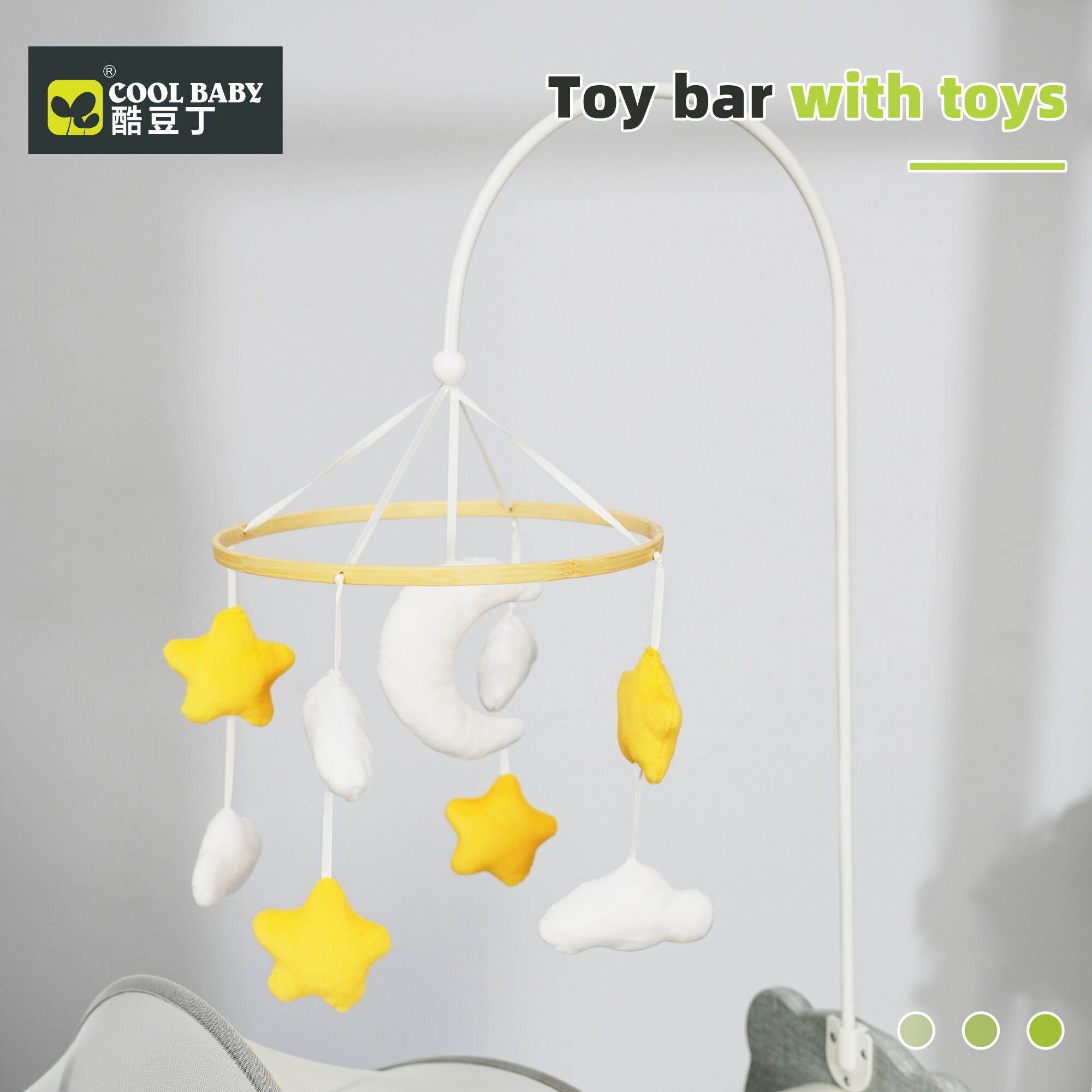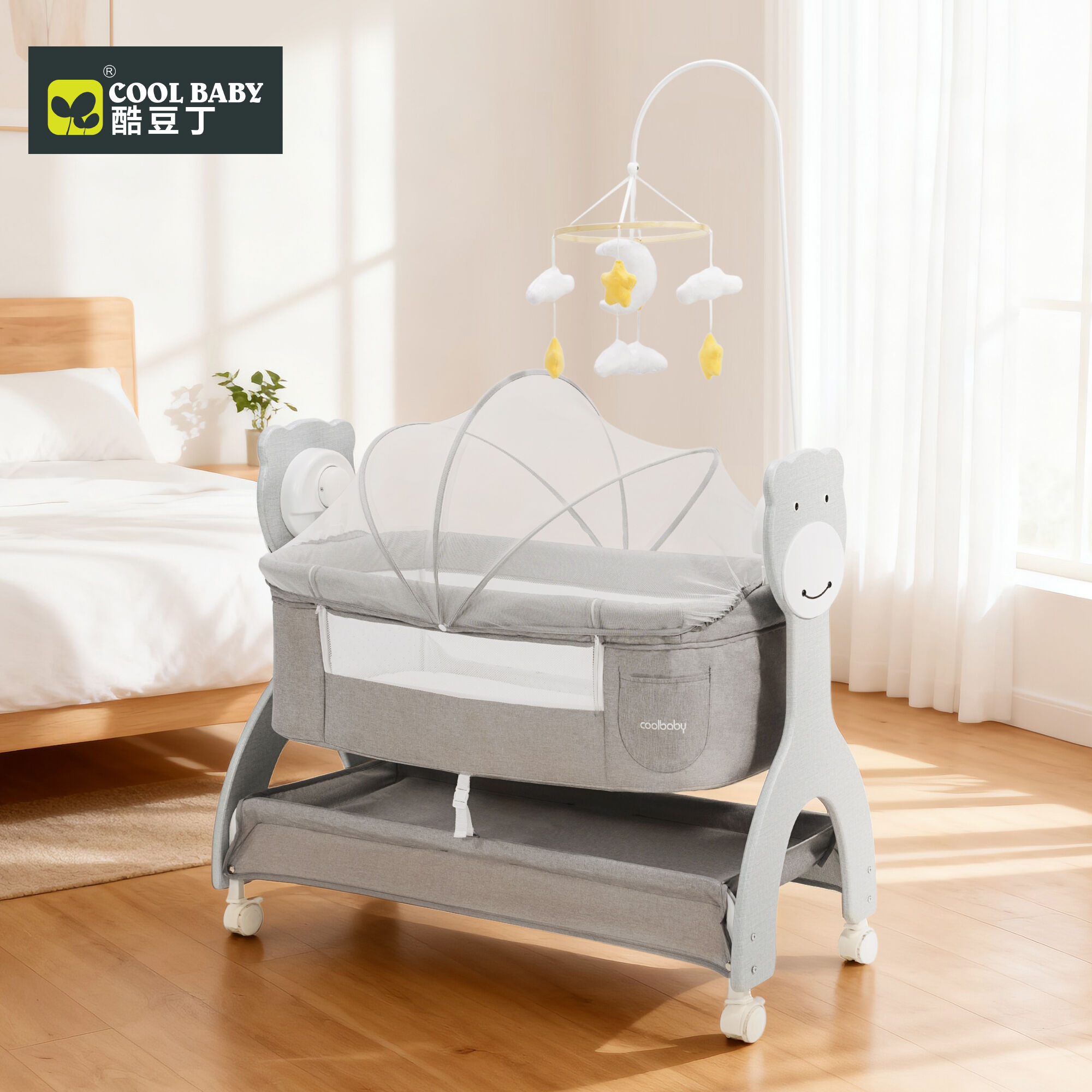 - Play & Soothe Extras: A ring-shaped toy bar (adorned with star and cloud plush toys) hangs above the crib, stimulating visual and tactile development; a soft monochrome night light casts a gentle glow for midnight check-ins; and built-in Bluetooth lets you play lullabies directly from your phone (controlled via the included remote for hands-free convenience).