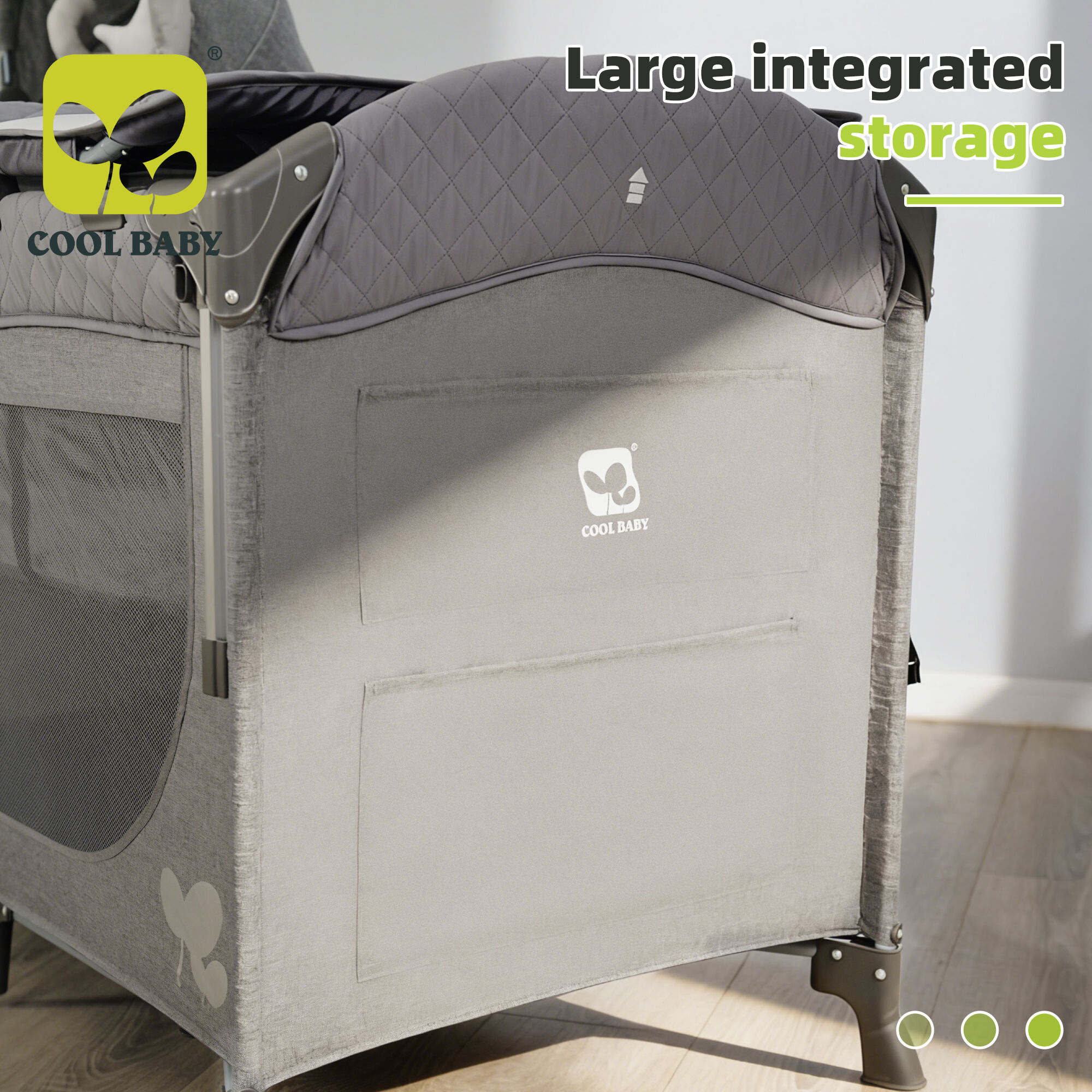 Large integrated storage: equipped with a large capacity storage bag, adopting a layered design, it can classify and store commonly used items such as diapers, wet wipes, bottles, clothing, toys, etc. for babies, making the baby's supplies neatly arranged, easy to access, avoiding disorder, and helping parents maintain a clean and orderly parenting space.