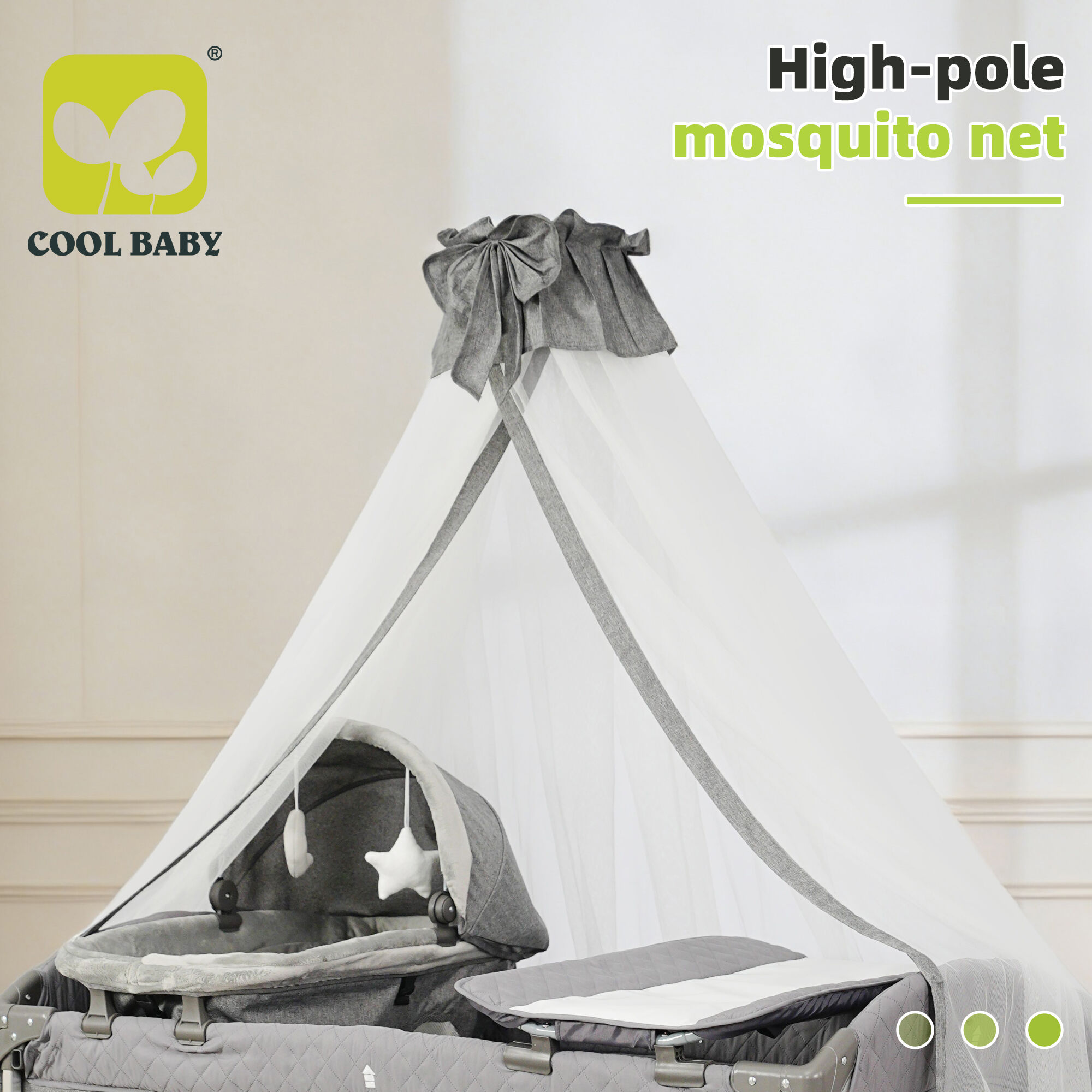 High pole mosquito net: Adopting a high pole design, the mosquito net has spacious space and does not suppress baby activities. The mosquito net has a fine mesh that can effectively block mosquitoes and dust from entering, creating a clean and safe sleeping environment for babies; At the same time, the mosquito net material is breathable, lightweight, and does not affect air circulation, ensuring smooth breathing for babies during sleep and suitable for use throughout the year.