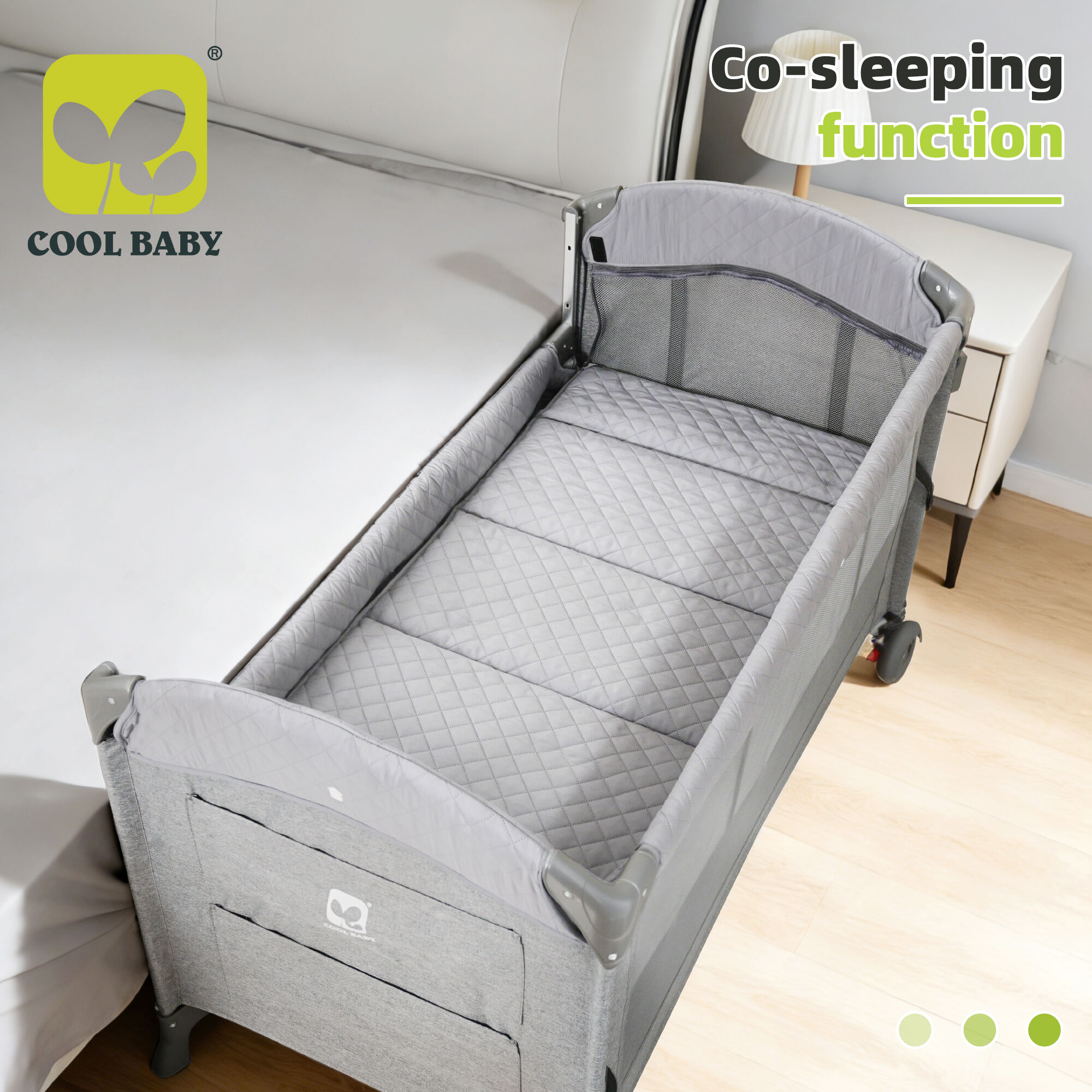 Co sleeping function: The product's side supports flexible opening and can be seamlessly connected to the parents' bed, allowing babies to maintain close contact with their parents. This not only facilitates night feeding and comfort, but also ensures independent sleeping space for babies, reducing safety hazards of parent-child bed sharing, and meeting the emotional connection needs between mother and baby.