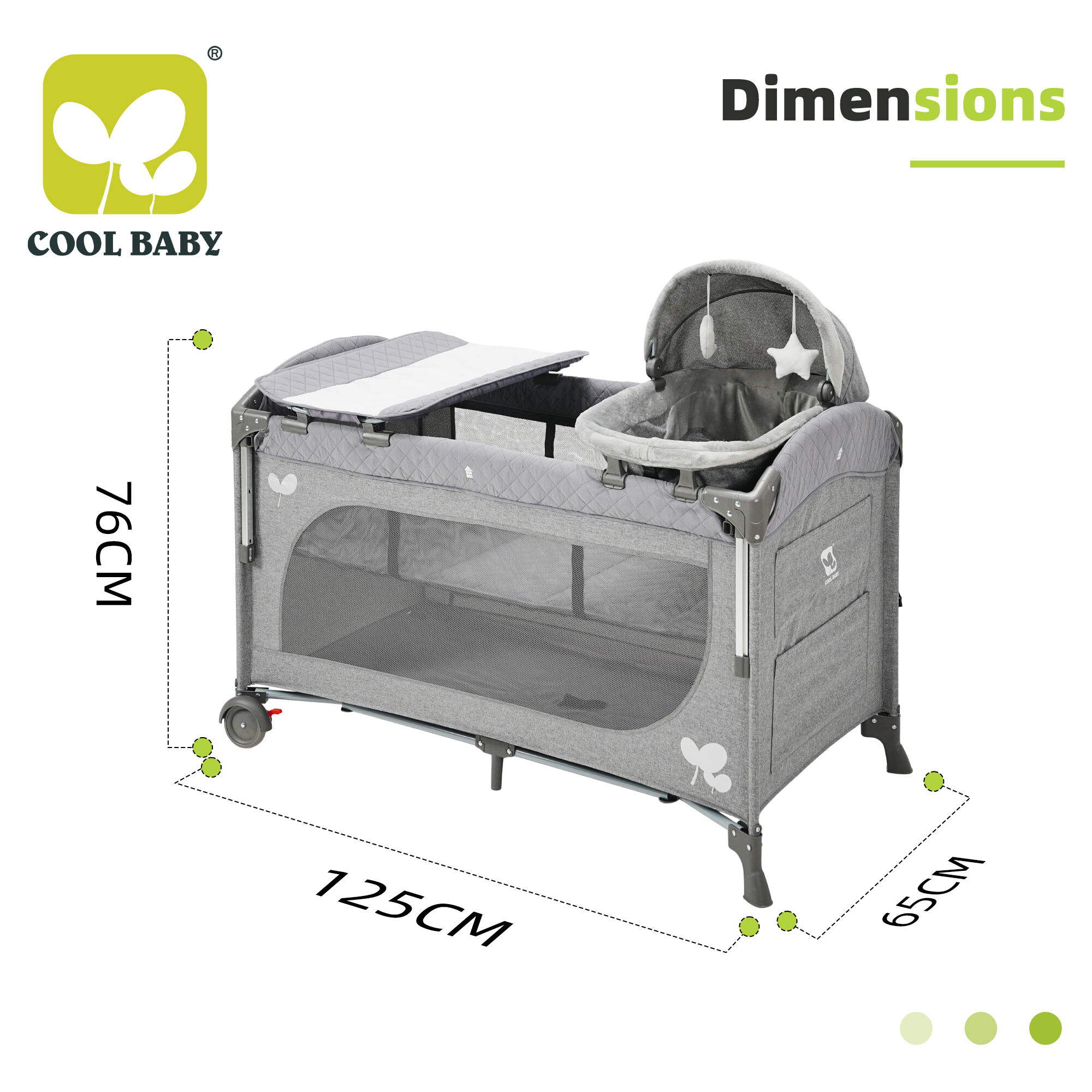 Diaper changer: Designed strictly in accordance with European safety standards, it has a stable structure and strong load-bearing capacity. The height of the diaper rack is moderate, making it convenient for parents to change diapers and clothes for their babies without bending over, effectively reducing the burden on parents' waist. At the same time, the diaper holder has a smooth surface without sharp edges and corners, avoiding scratching the baby and ensuring safe and reliable use.