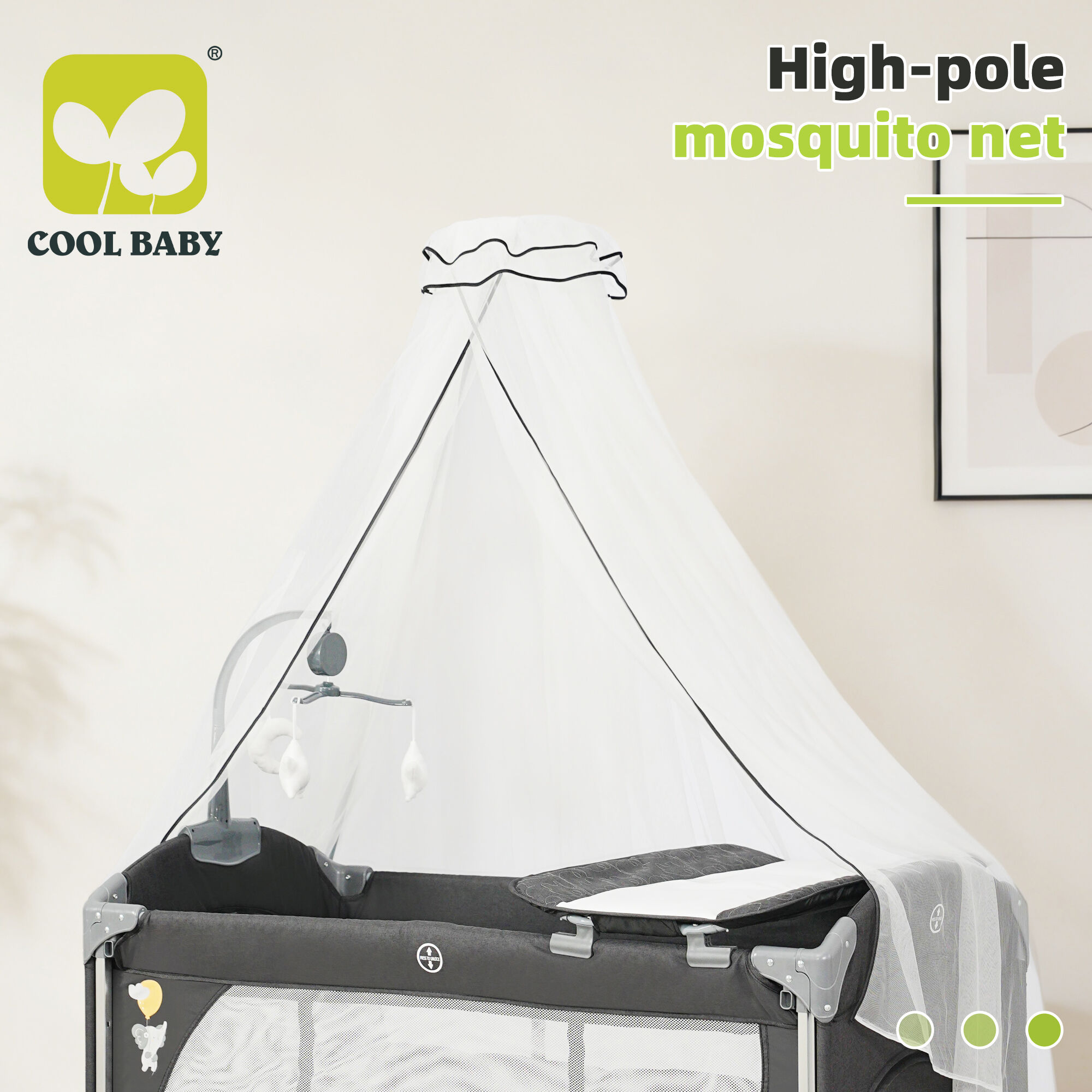 High-pole mosquito net: A tall, full-coverage net (noted as ) provides protection against insects while ensuring proper airflow, keeping babies comfortable and safe during naps or sleep—especially in warm, mosquito-prone environments.
