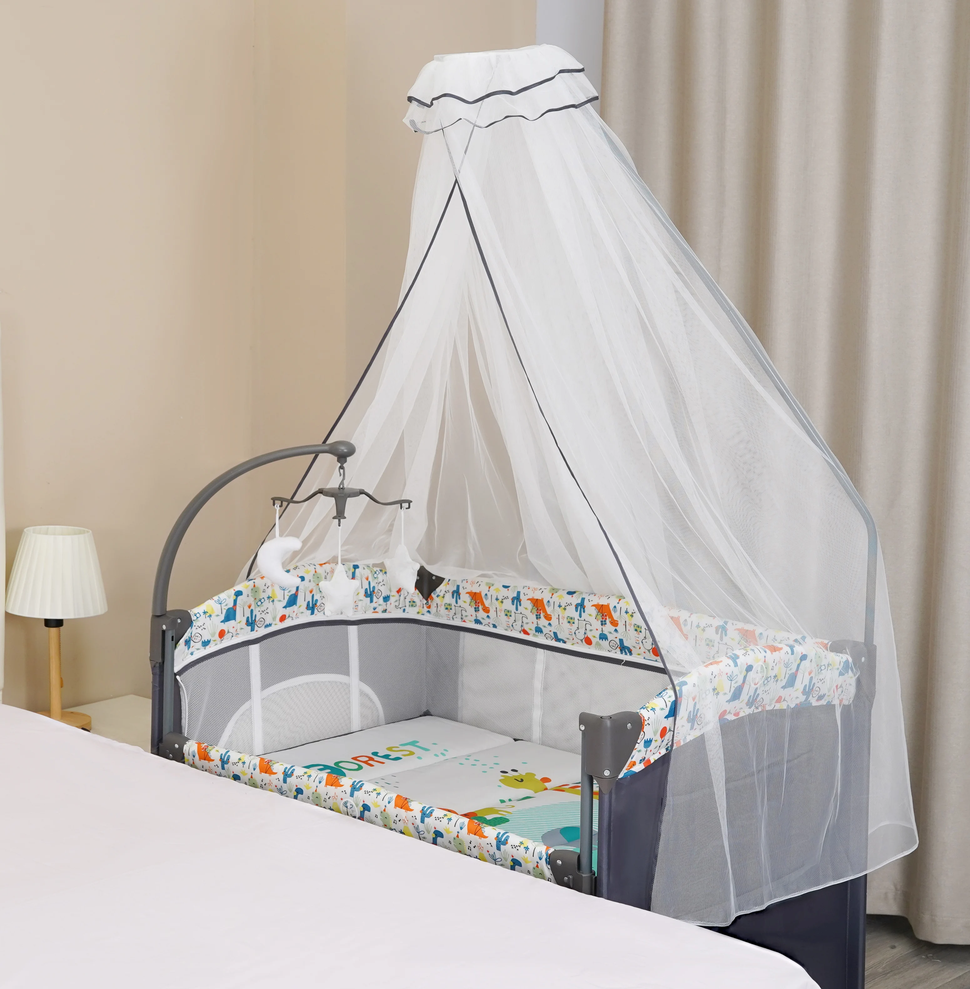 All-in-One Multifunctional Design for Comprehensive Care: Integrates 8 core functions—co-sleeping bed, playpen, foldable mattress, diaper changer, rocker, high-pole mosquito net, toy bar, and easy-access entrance. This “one-stop” solution eliminates the need for separate baby gear (e.g., standalone rockers, diaper stations, or toy racks), saving home space and streamlining daily tasks like feeding, sleeping, playing, and diaper changes. It’s ideal for busy families seeking efficiency and versatility.