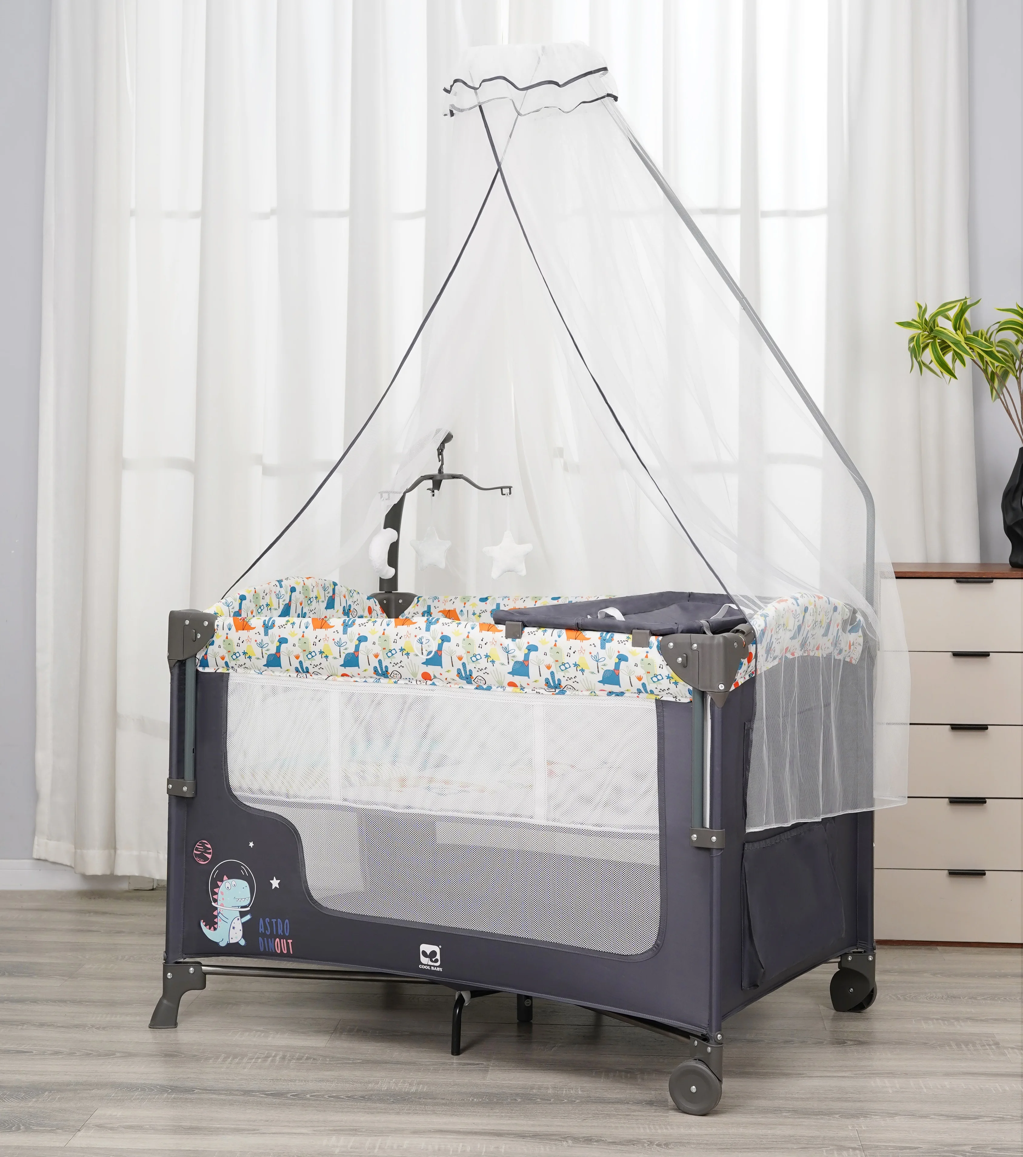 Cute Dinosaur Printing for Aesthetic Appeal & Baby Attraction: Features a charming dinosaur print design that adds a playful, child-friendly touch to the playpen. The vivid, cute pattern not only enhances the visual appeal of the baby’s nursery or play area but also attracts the baby’s attention—making the playpen a more engaging space for play and rest. It stands out from plain playpens, catering to parents who want functional gear with delightful, theme-based aesthetics.