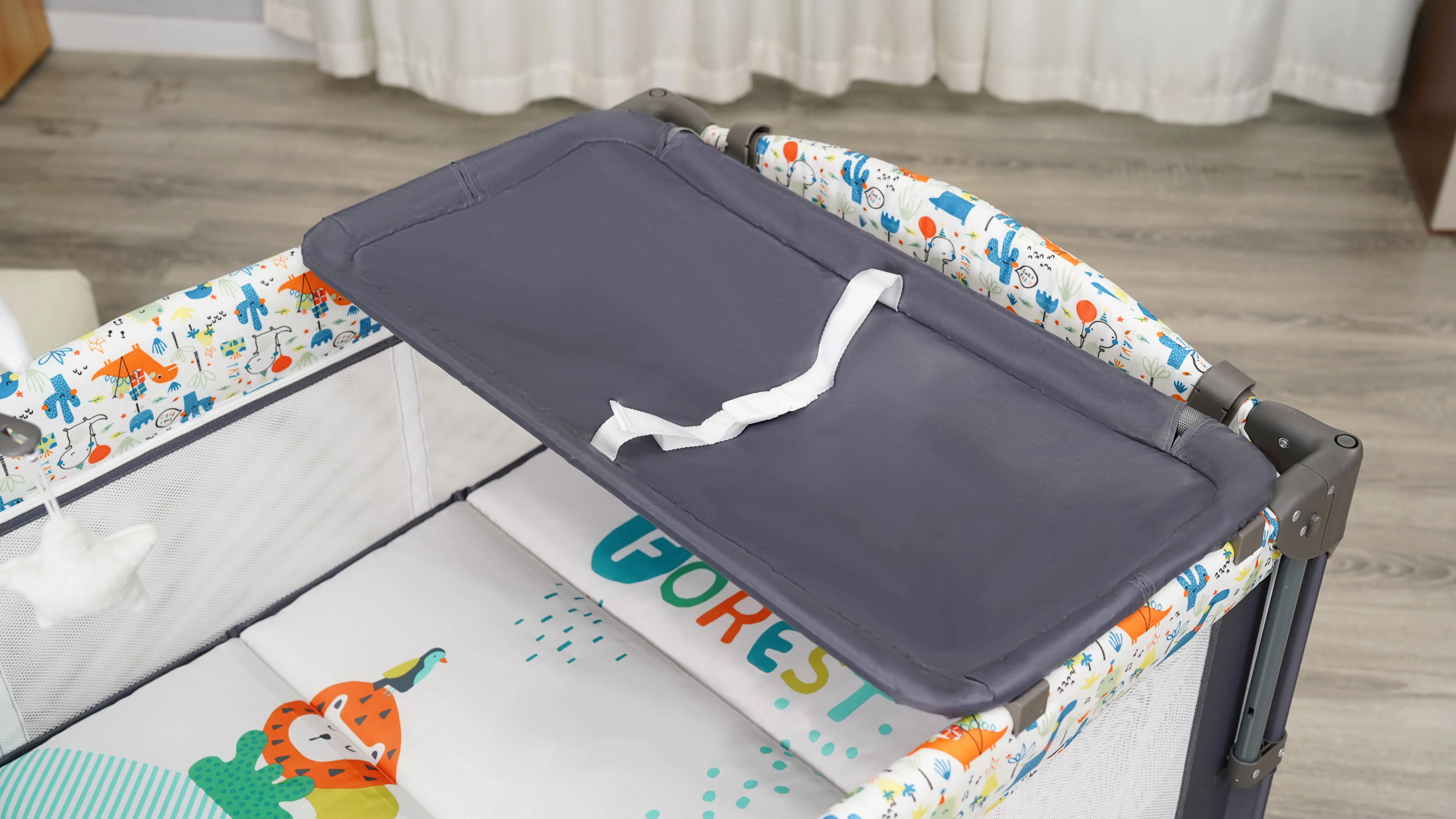 External Diaper Changer for Convenient & Tidy Care: Features an external diaper changer that mounts or extends outside the playpen—keeping the changing area separate from the baby’s sleep/play space for better hygiene. The changer provides a stable, flat surface for diaper changes, reducing back strain for parents (no need to bend over beds or floors). Its external design also keeps the playpen’s internal space uncluttered, ensuring the baby has ample room to move.