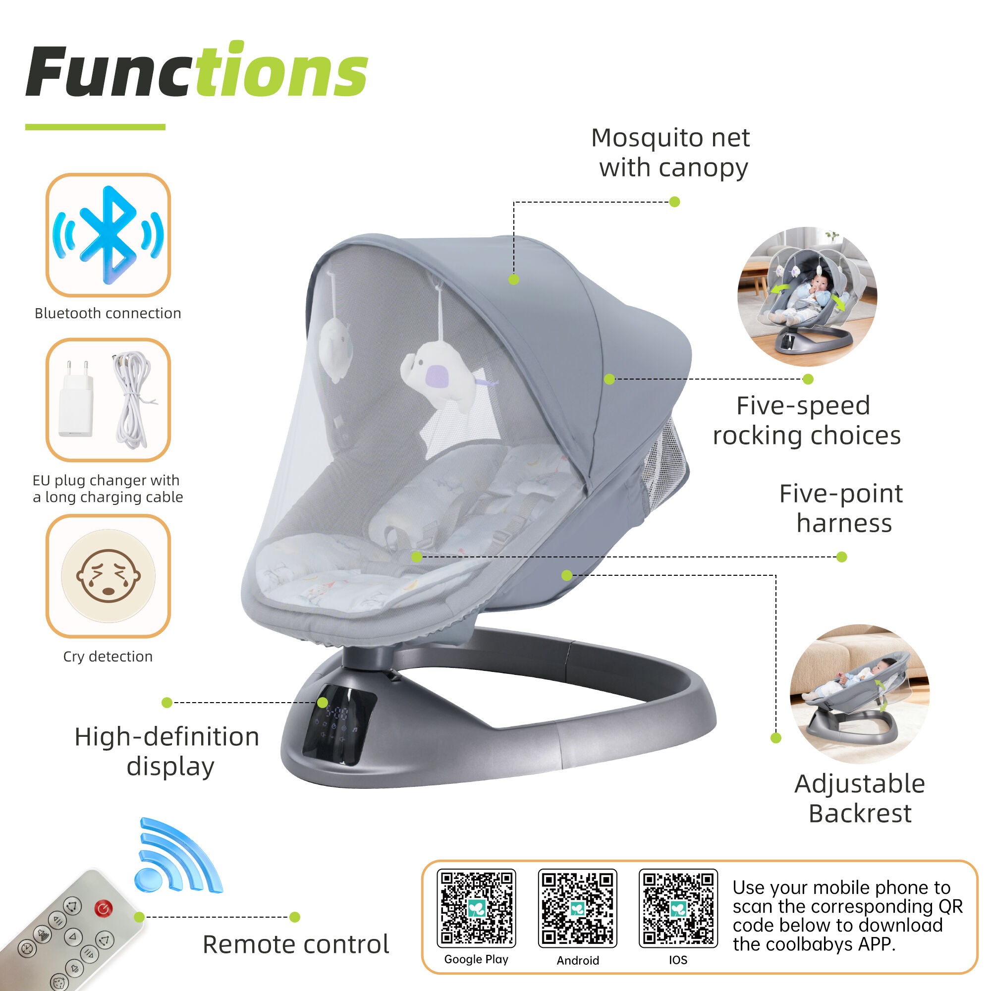 High-definition display. Five-speed rocking choices. 3 timer settings. Cry detection. Five-point harness. Adjustable backrest. Bluetooth connection. Mosquito net with canopy. App control. Remote control. 11 lullabies with volume control. EU plug changer with a long charging cable. |