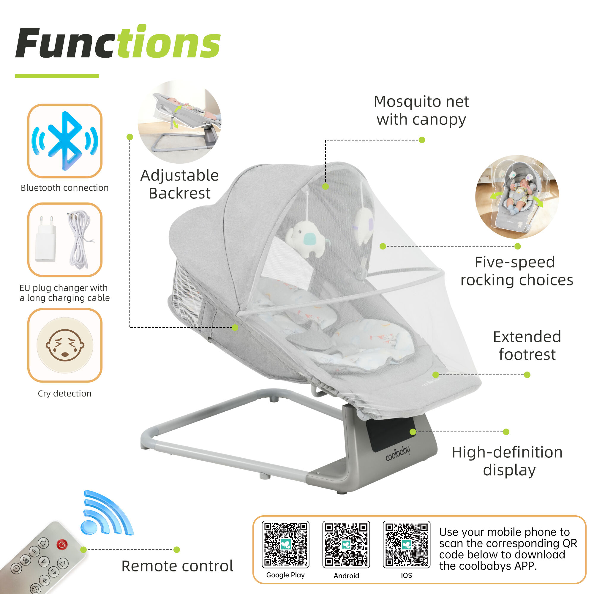 Bệ để chân kéo dài. Màn hình độ phân giải cao. Lựa chọn rung 5 tốc độ. ba thiết lập hẹn giờ. Dây đai an toàn năm điểm. Phát hiện tiếng khóc. Tựa lưng điều chỉnh được. Kết nối Bluetooth. Điều khiển từ xa. 11 bản nhạc ru có điều chỉnh âm lượng. Mùng chống muỗi có mái che. Bộ đổi phích cắm EU với dây sạc dài. |