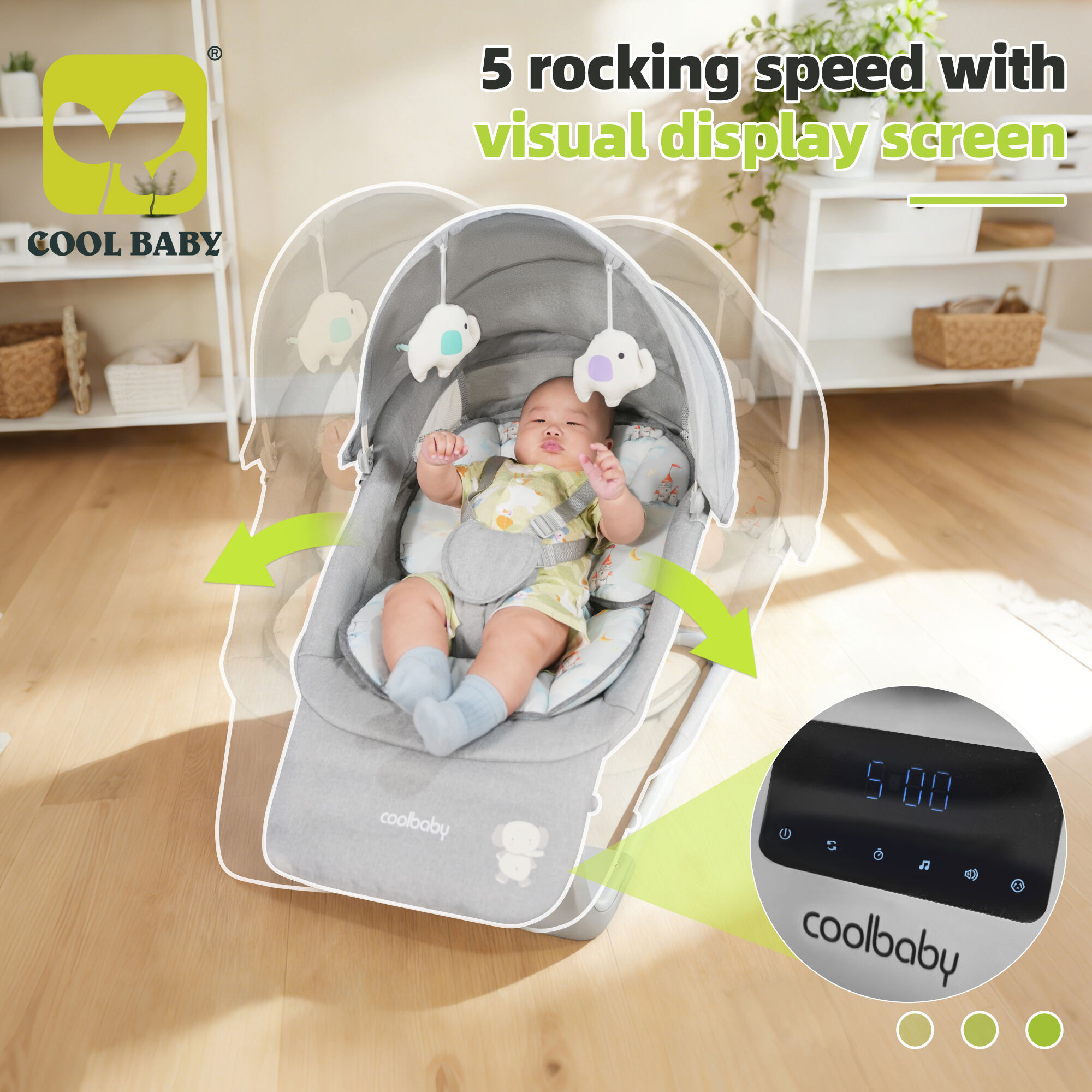 đung Đưa 5 Tốc Độ & Màn Hình LCD để Điều Khiển Trực Quan: Được trang bị 5 mức tốc độ đung đưa điều chỉnh được, cha mẹ có thể chọn nhịp điệu phù hợp nhất (từ nhẹ nhàng đến đung đưa sôi động hơn) dựa theo tâm trạng của bé — giúp ru bé quấy khóc ngủ ngoan hoặc giải trí cho bé đang tỉnh táo. Cái võng đi kèm màn hình hiển thị LCD trực quan, rõ ràng hiện thị các thiết lập hiện tại (tốc độ đung đưa, bộ hẹn giờ, âm lượng nhạc, v.v.), loại bỏ sự đoán mò. Cha mẹ dễ dàng kiểm tra và điều chỉnh chế độ chỉ bằng một cái nhìn, giúp thao tác trở nên trực quan và tiện lợi.